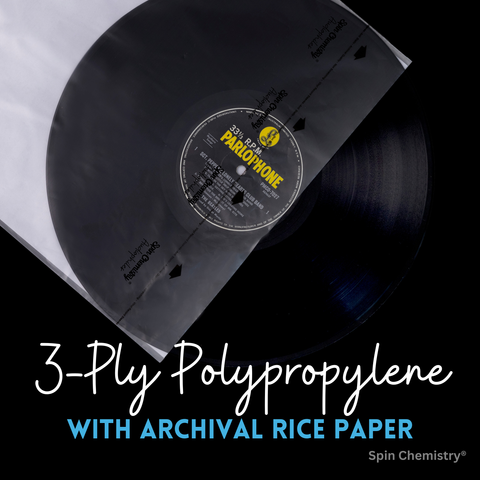 Spin Chemistry® inner sleeves are anti-static, with a 3-ply polyethylene on one side and Archival Rice Paper on the other. The acid-free and anti-static material ensures no risk of damage to your records.